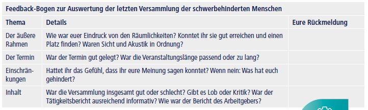 Nach der Versammlung ist vor der nächsten Versammlung. Fragen Sie am Ende der letzten Zusammenkunft nach, wie sie bei den Kollegen und Kolleginnen angekommen ist. Sie werden Anerkennung erhalten und vielleicht Kritik. Haben Sie den Eindruck, dass sie kein ehrliches Feedback erhalten, können Sie es mit einem Fragebogen wie dem folgenden versuchen.
